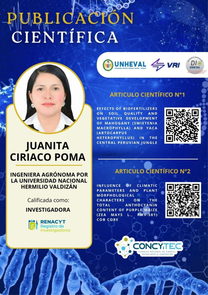 ✅ Nos complace anunciar que la Ing. Juanita Ciriaco Poma, destacada Ingeniera Agrónoma egresada de nuestra casa de estudios, la Universidad Nacional Hermilio Valdizán, ha sido reconocida como investigadora en el RENACYT (Nivel VII), un mérito alcanzado gracias a su destacada producción científica y compromiso con la investigación de alto nivel.